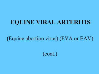 | Pathogenesis: - Infection of the lymphoid tissue of the nasopharynx then a leucopaenia and immunosuppresion.. Pathognomic medial necrosis of arteries. This lesion is responsible for oedema, haemorrhage and more rarely, thrombosis and infarction. Conjunctivitis and palpebral oedema give the name 'pink eye'. Oedema is also seen in the legs and lower abdomen. - Thoroughbred stallions have been shown to be intermittent or persistent shedders of virus, with the accessory sex glands (prostate and seminal vesicles) being the sites of persistence. - Virus infects the respiratory and alimentary tract resulting in nasal catarrh, coughing, dyspnoea (pleurisy), diarrhoea and colic. - Abortions occur 10-30 days after infection in 50% of pregnant mares. Congenital infection can also occur. |