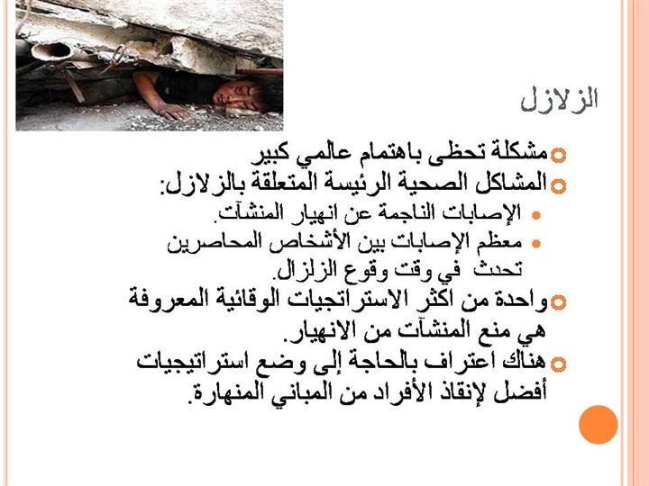 ان إصابات وكسور الرأس والصدرهي الاكثر شيوعا في ضحايا الزلزال. و الممرضون يمثلون المهارات السريرية التي يمكن أن تنقذ الأرواح وذلك في البحث واسترجاع المحاصرين من الأفراد. والتمريض يمكن أن يؤدي دورا رئيسيا في حماية فرق الانقاذ حيث يبلغ معدل الاصابة اعلى مستوياته لأول المستجيبين من فرق الانذار. في الحقيقة ينبغي أن يكون في كل فرق الانقاذ ممرض واحد على الأقل. |