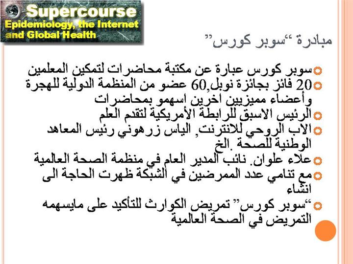 هي أفضل وسيلة لتحسين الصحة في العالم والتدريب العلمي؟ 64.000 عضوا من هيئات التدريس من 172 بلدا الذين اوجدوا مكتبة المصادر ب 3500 مصدرا. لدينا أكثر من 1200 من المدارس الطبية والصحة العامةالمتعاونة باستخدام المحاضرات. في الأشهر ال 12 الماضية قمنا بتدريس أكثر من 1 مليون طالب وطالبة في جميع أنحاء العالم. |