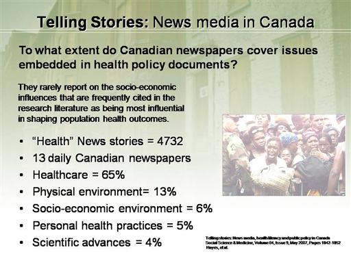 Telling stories: News media, health literacy and public policy in Canada Social Science & Medicine, Volume 64, Issue 9, May 2007, Pages 1842-1852 Hayes, et al. |
