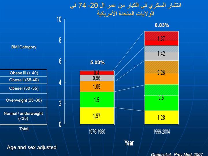 In 1976-1980 the prevalence was 5.03%. In 1999-2004, the prevalence is 8.8. In 1988-1994 it was roughly half way in between or 7.02%, but I am not showing that on this slide. Now, when we partition the prevalent diabetes cases in to their respective BMI categories, we see that of the 5 cases, there were about 1.6 cases who were lean, 1.5 …….etc. When we do the same in 1999-2004, se see that there was a slight decline in the % who werein the normal/underwight group, an increase of 1 prevalent case per 100 populatoin who was diabetic and overweiht, an increase of 1.2 who were obese. What we are doing in this analysis is simply taking the excess cases from each group, and examining the BMI contribution of those groups. |