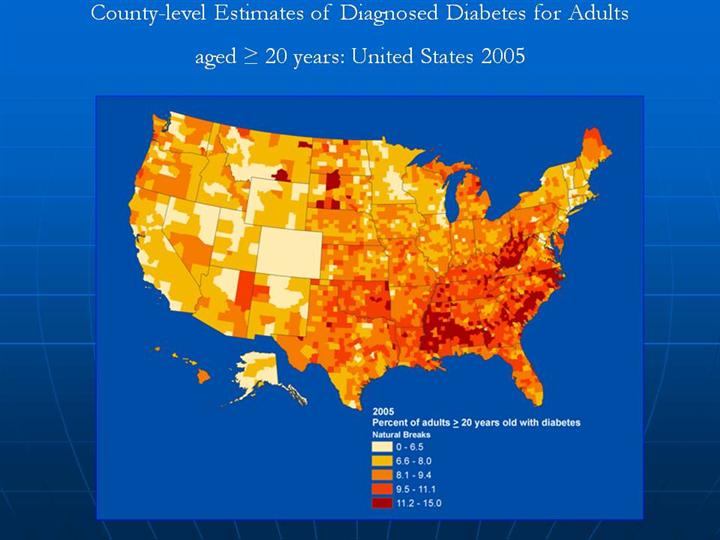 The percent of U.S. adults who are obese or who have diagnosed diabetes was determined by using data from the Behavioral Risk Factor Surveillance System (BRFSS, available at http://www.cdc.gov/brfss). An ongoing, yearly, state-based telephone survey of the non-institutionalized adult population in each state, the BRFSS provides state-specific information on behavioral risk factors for disease and on preventive health practices. Respondents who reported that a physician told them they had diabetes (other than during pregnancy) were considered to have diagnosed diabetes. Self reported weight and height were used to calculate body mass index (BMI): weight in kilograms divided by the square of height in meters. A BMI greater than or equal to 30 was considered to be obese. Rates were age-adjusted using the 2000 U.S. Standard Population.