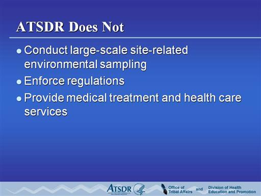 ATSDR does not have the legal authority to provide medical care or treatment to people who have been exposed to hazardous substances or provide funds for relocation or clean up of a site. ATSDR advises, consults, and assists public or private health care providers. It is a non-regulatory agency. It only recommends actions that need to be taken to safeguard health of community members. |