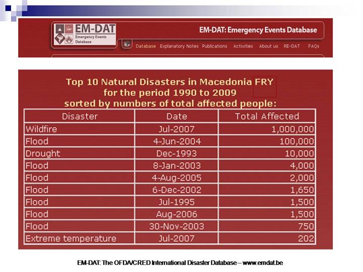 Macedonia is vulnerable to floods. In the group of 10 natural disasters sorted by numbers of total affected people in the period of 1990-2009 floods were most leading causes.