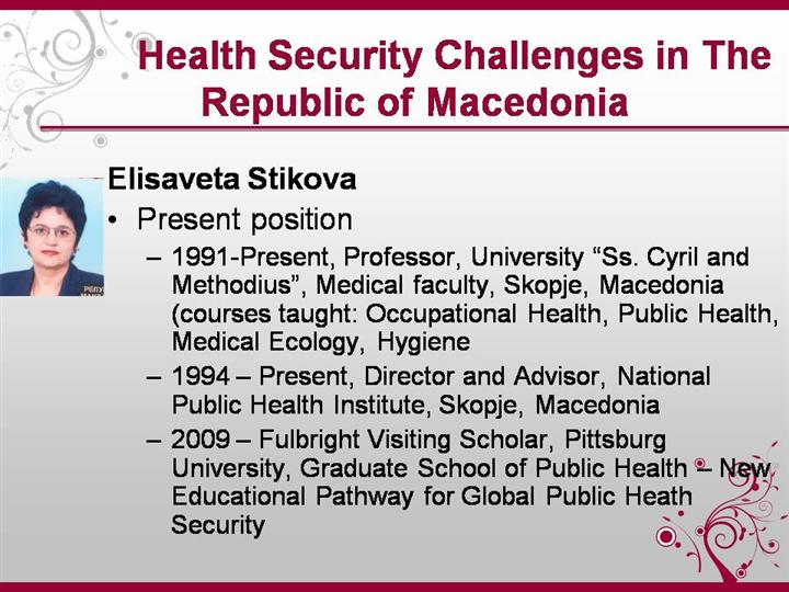 Previous experience: 2000 - 2002 - Director, National Public Health Institute (Republic Institute for Health Protection), 1998 - 2000 - Deputy-Director, Health Center “Skopje”, 1994 - 1998 - Director, National Public Health Institute (Republic Institute for Health Protection), 1983 - 1994 - Chief of the Department for planning and organization, Institute for Occupational Health, 1980 - 1982 - Industrial physician, Institute for Occupational Health. Other relevant positions: 2007 - Visiting Professor, Erasmus Mundus Europubhealth Master Studies, University of Sheffield, Sheffield, UK, 2007 - Visiting professor, Erasmus Mundus Europubhealth Master Studies, University of Krakow, Poland, 2006 - NATO Partner Country Co-director, Advanced Study Institute, Science for Peace and Security Program, 2004 - Study visit, Braun School of Public Health, Jerusalem, Israel 2003 - Study visit, Bordeaux and Bilbao, Preparation of New Curricula in the Field of Environmental and Occupational Health, 2003 - Study visit, Stanford University, USA, Environmental and Occupational Health Services, Risk assessment, 2002 - Professor, Medical Faculty, Courses: Environmental and Occupational health; Occupational Health 2002 - Professor, School of Dentistry, Course: Medical Ecology, 2000 - Professor, School for Education, Courses: Preschool Hygiene; School Hygiene, 1997 - Associate Professor, Medical faculty, Course: Hygiene and Occupational Health, 1990 - Assistant Professor, Medical faculty, Course: Hygiene, Social Medicine and Occupational Health, 1985 - Assistant, Medical Faculty, Topic: Hygiene, Social Medicine and Occupational Health. Specialization: (i) main field Occupational Health (ii) other fields Risk Analysis Public Health Accreditation criteria, quality assurance, ISO/IEC standards(ISO 9000, ISO 45000 and ISO17025), Global Survey - Disease surveillance, Detection and Response page 2 of CV Epidemiology, Medical Statistics, Health Indicators and Data Presentation System Food Safety and Control, Codex Alimentarius and HACCP (iii) current research interest Chemical, biological and radiological risk assessment; rapid detection of CBR agents, susceptibility of population; biological monitoring; health impact assessment; public health preparedness and response; bioterrorism; pandemic flu; climate change; food safety and control. |