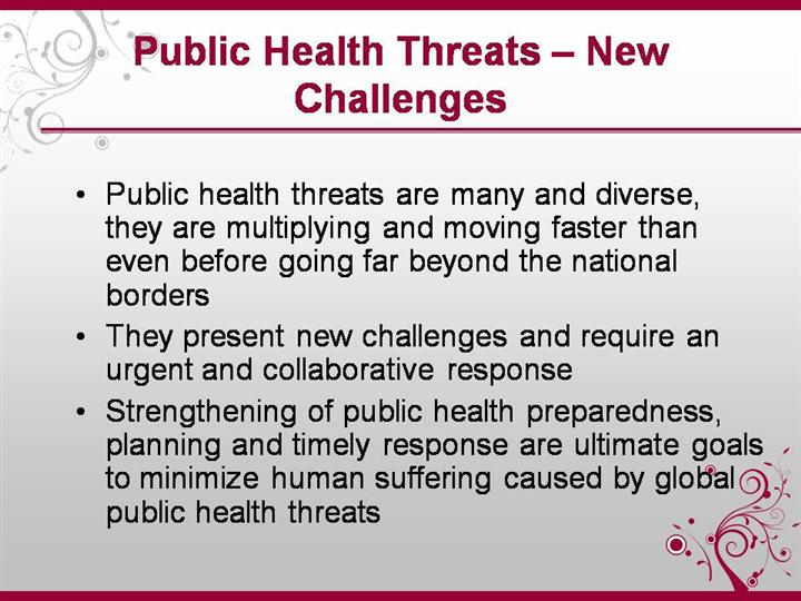 The spread of new and re-emerging communicable and non communicable diseases, natural disasters, environmental change, bioterrorism or chemical spills can all have a major impact on people, their societies and economies around the world. Such threats present new challenges and require an urgent and collaborative response. Health, development and global security are inextricably linked. Investment in health is a cornerstone of economic growth and development. Moreover, the security of all countries is today increasingly dependent on the capacity of each to act effectively, and collectively, to minimize health threats. Life and health are our most precious possessions. We have the knowledge and unprecedented resources to build a healthier and safer world. Now we have to mobilize the political will and to ensure that each country -- rich and poor -- has a robust health system capable of serving all those in need. |