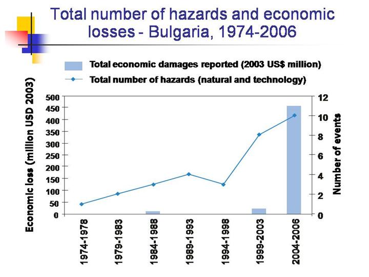 The reports show economic losses of USD 477 million due to flood and wind, with flood contributing the major share. The National Geophysical Data Center reports that the country has incurred a loss of USD 5 million due to earthquake during the last 33 years. This economic loss equals about 0.3 per cent of the country’s GDP (USD 14.76 million). |