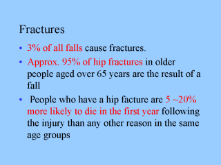 two consequences of a fall. Falls account for 87% of all fractures for people 65 years and older. An estimated 1 ~ 2 % of of falls cause hip fractures which account for the majority of fall-related morbidity and mortality; 3~ 5 % of falls result in other type of fractures, e.g. hand, and ankle fractures (Sattin 1992). The most common sites of fractures include hip, spine, hand, forearm, leg and ankle. Nine out of ten hip fracture in older people result from a fall. People who have a hip fracture are 5 ~20% more likely to DIE in the first year following that injury than any other reason. Falls are related to placement of nursing home care. Compared with elderly persons who are non-fallers, elder persons who have fallen need three times more requirement of nursing home care. 20% of older persons who hospitalized did not able to return to home but had to go to rehabilitation facilities or dependent living (Kiel et al., 1991). |