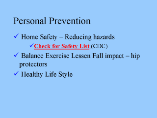Several strategies have been shown to reduce the risk of fall-related injuries and deaths. These include regular exercise to improve strength and balance; review and adjustment of medications by a health care professional to avoid side effects such as dizziness, drowsiness, or disorientation; and home modifications such as installing grab bars, removing tripping hazards, increasing lighting, and installing rails on both sides of stairs. |