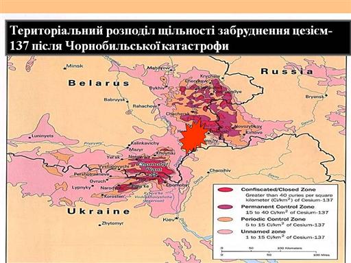 26 квітня 1986 року в м. Прип’ять (Україна) на Чорнобильській атомній електростанції сталася найбільша ядерна аварія, наслідки якої набули характеру катастрофи. В результаті аварії в перші місяці від гострих променевих уражень загинули 28 людей. Для ліквідації наслідків аварії були залучені більше 600 тисяч спеціалістів, серед яких було 200 000 українців, яких надалі назвали ліквідаторами. Основні великомасштабні роботи проводилися до 1990 року. Саме цей період і було включено до більшості наукових досліджень. У результаті вибуху і викиду радіоактивних матеріалів було забруднено велику територію України, Білорусі та Росії. Щільність забруднення радіоактивним цезієм-137 представлена на карті. Так само наведені рівні зміщення забруднення Cs-137 навколо Чорнобиля.