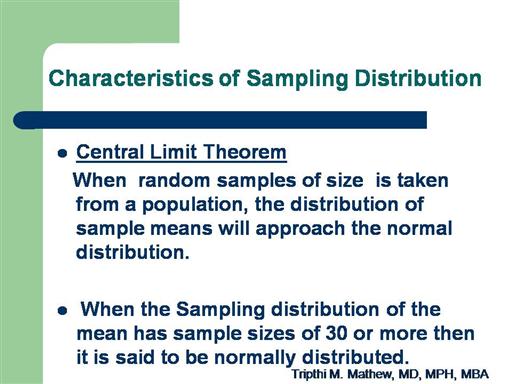 So we can see that as the sample size increases to 30 or more then it resembles a normal distribution, therefore the size of the random sample is a very important feature of sampling distribution. |