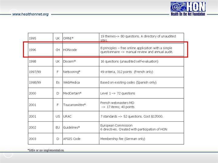 HON has the distinction of being the most popular and longest standing active quality controlling body. HON has drafted the code and obtained consensus on its contents. Other codes developed since then are based on the same principles e.g. the EU criteria created with the participation of HON. |