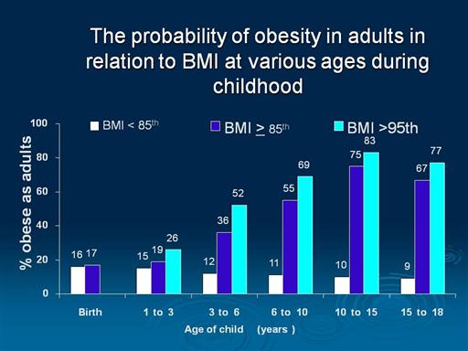 The tracking of BMI that occurs from childhood to adulthood is clearly shown in data from a study by Robert Whitaker (Children’s Hospital Medical Center in Cincinnati) and colleagues. They examined the probability of obesity in young adults in relation to the presence or absence of overweight at various times during childhood. For example, in children 10 to 15 years old, 10% of those with BMI-for-age < 85th percentile were obese at age 25 whereas 75% of those with a BMI-for-age > 85th percentile were obese as adults and 80% of those with a BMI-for-age > 95th percentile were obese at age 25. (The sample size for the study was 854.) This study clearly shows that an overweight child is more likely than a child of normal weight to be obese as an adult. Other studies have shown this same trend of tracking occurring from childhood to adulthood.The likelihood childhood obesity persists into adulthood obesity is related to the age, the older the more likely, not the duration. Adipocyte hypertrophy precedes hyperplasia ,(critical size then hyperplasia) wt loss is achieved by reduction in vol. Not # of adipocytes |