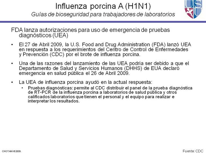 FDA autoriza uso de emergencia de medicamentos anti virales, pruebas diagnósticas, en respuesta al brote de la griupe porcina en humanos (Comunicado de noticias), . Rockville, MD: U.S. Food and Drug Administration. 27 de Abril 2009. http://www.fda.gov/bbs/topics/NEWS/2009/NEW02002.html. Acceso 28 Abril 2009.