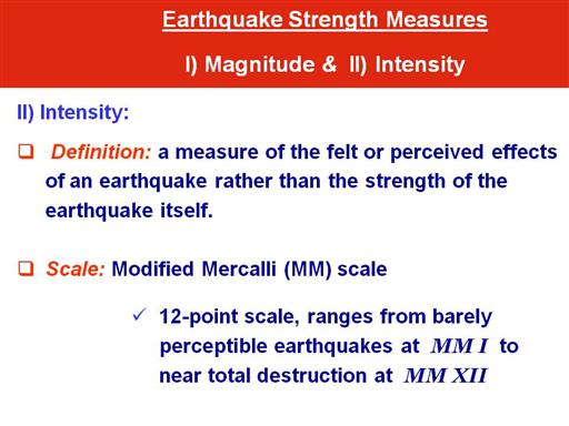 Modified Mercalli (MM) Scale Categories: I. Felt only by a very few people under especially favorable circumstances II. Felt only by a few people at rest, especially on the upper floors of buildings. Suspended objects may swing. III. Felt quite noticeably indoors. Standing motor vehicles may rock slightly. Vibration like the passing of a truck. IV. Felt indoors by many, outdoors by a few. At night, some awakened. Crockery, glassware, windows, doors rattle. V. Felt by nearly everyone; damage to contents and structures uncommon but possible. VI. Felt by all; many frightened and run outdoors; damage slight. VII. Everybody runs outdoors; damage negligible to buildings seismically well-designed and constructed; slight to moderate to ordinary structures; considerable damage to poorly built or badly designed structures. VIII. Damage slight in well-designed, considerable in ordinary, and great in poorly built structures; chimneys, monuments, walls, etc., fall. IX. Damage considerable to well-designed structures, and great (including partial or complete collapse) in other buildings; buildings shifted off foundations; underground pipelines disrupted. X. Some well-built wooden structures destroyed; most masonry and ordinary structures destroyed; railroad tracks bent; landslides common; water spills over banks of streams, lakes, etc. XI. Few, if any, masonry structures remain standing; bridges are destroyed; broad fissures open in the ground; underground pipelines are completely out of service; earth subsides. XII. Damage is total; waves are seen propagating along surface of the ground; nearly impossible to stand; objects thrown up into the air. |