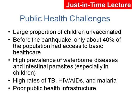Even before the earthquake Haiti suffered from poor public health infrastructure and little preventive services, leading to high prevalence of infectious disease, low life expectancy, and many other preventable conditions. Lack of well developed public health infrastructure makes disaster mitigation difficult in the events of major disasters. |