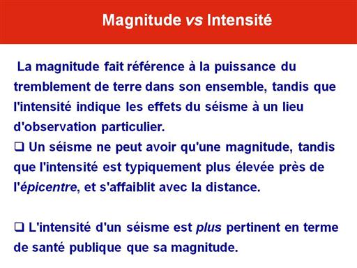 ”L'intensité est attribuée à un lieu particulier en fonction des conséquences visibles du tremblement de terre, et des témoignages des personnes qui ont subi le tremblement. L'échelle des intensité permet également les comparaisons avec les tremblements de terre qui ont eu lieu avant le développement des outils de mesure des évènements sismiques. La destruction causée par un tremblement de taire est fonction de son intensité et de la résistance des structures aux dégâts sismiques” |