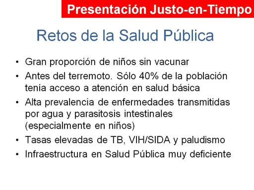 Aún antes del terremoto, Haití tenía pobre infraestructura en Salud Pública y pocos servicios preventivos, dando lugar a elevada prevalencia de enfermedades infecciosas , esperanza de vida baja y otras condiciones prevenibles. Falta de infraestructura de salud pública bien desarrollada hace que la mitigación sea difícil en casos de desastres mayores. |