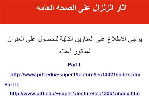 الدروس المستفادة من اوبئة الكوارث من زلزال بامDec 26, 2003 Iran. Part`1- 7 http://www.pitt.edu/~super1/lecture/lec15221/index.htm