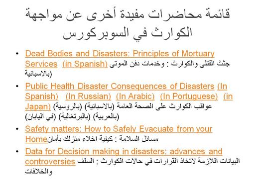 Dead Bodies and Disasters: Principles of Mortuary Services (in Spanish) جثث القتلى والكوارث : وخدمات دفن الموتى(بالاسبانية Public Health Disaster Consequences of Disasters (In Spanish) (In Russian) (In Arabic) (In Portuguese) (in Japan) عواقب الكوارث على الصحة العامة (بالاسبانية) (بالروسية) (بالعربية) (بالبرتغالية) (في اليابان Safety matters: How to Safely Evacuate from your Homeمسائل السلامة : كيفية اخلاء منزلك بأمان Data for Decision making in disasters: advances and controversiesالبيانات اللازمة لاتخاذ القرارات في حالات الكوارث : السلف والخلافات |