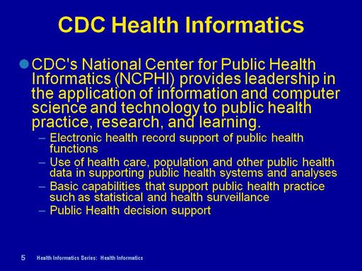 The CDC NCPHI has a health informatics mission that it defines with these functions:
