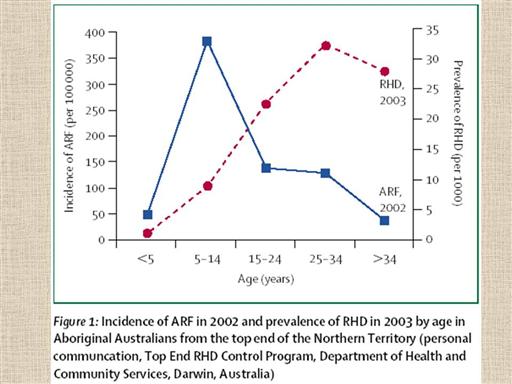This graph depicts the relationship between incidence of acute rheumatic fever and the detection of rheumatic heart disease. Carapetis. Lancet 2005;366:155 |