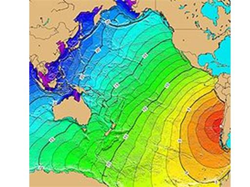 Mapa que muestra el tiempo de viaje del tsunami a través del Pacífico y más allá. Las líneas son de intérvalos de una hora durante el terremoto de 1960. http://en.wikipedia.org/wiki/1960_Valdivia_earthquake
