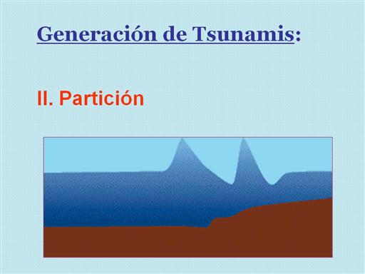 “II. Partición: Después de varios minutos del terremoto, el tsunami inicial es particionado en un tsunami que viaja al océano profundo (tsunami distante) y otro tsunami que viaja hacia la costa más cercana (tsunami local). La altura sobre el promedio del nivel del mar de los dos tsunamis es aproximadamante la mitad del tsunami original (es algo modificado en tres dimensiones, pero la misma idea se mantiene.) La velocidad a la cual ambos tsunamis viajan varia en base a la raíz cuadrada de la profundidad del agua. Por lo tanto el tsunami de océano profunda viaja más rápido que el tsunami local a la costa cercana.”