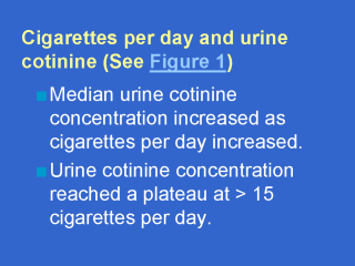 | We found that although urine cotinine concentration increased as cigarettes per day increased, urine cotinine concentration reached a plateau at approximately 15 cigarettes per day. |