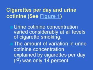 ng/ml to 10,000 ng/ml. The amount of variation in urine cotinine concentration explained by cigarettes smoked per day was r2 = 14 percent. |