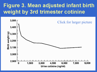 | Again, birth weight decreases sharply then levels off, although the effect is not as dramatic as when cigarettes per day is used. |