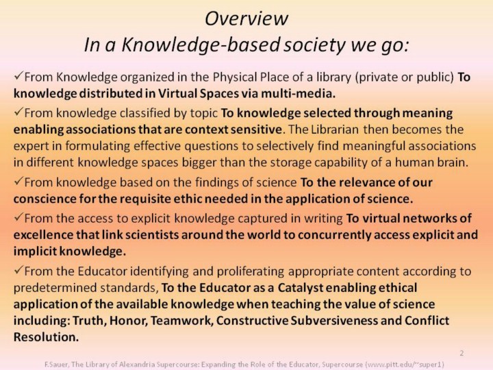 Until 200 years ago, the existing perceived world knowledge was essentially manageable by encyclopedists as Voltaire (1694-1778). The conceptual processing of knowledge was reserved for a very small and powerful elite of thinkers, i.e. clergy, philosophers or civil leaders, Today the abundance of knowledge requires that everyone processes only a fraction of the knowledge available, as it is not possible to assimilate all of it for its use when needed. This new requirement creates the need for people to connect and work cooperatively in co-creative relationships. We also claim that as connectedness and understanding increase they create a greater space for invention which is necessary for innovation (commercialization of inventions). This has the potential to level the playing field for developing nations as associations can be digitally develop cross national and political boundaries. And it holds a promise to move the relationship of Educator and Student from the level of how to apply knowledge to the level of how to assess the value of the current knowledge and how to create new knowledge. The educator becomes then a catalyst with an ethical responsibility to balance individual development with community development |