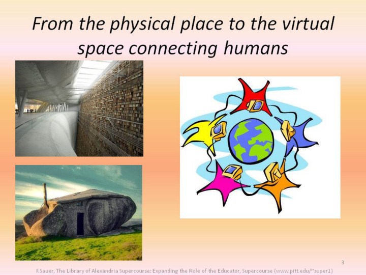 When the Library of Alexandria was burned and completely destroyed, the unique content of its encoded explicit knowledge was lost for humanity. Today, two millennium later, the Library of Alexandria Supercourse (http://www.pitt.edu/~super1/)