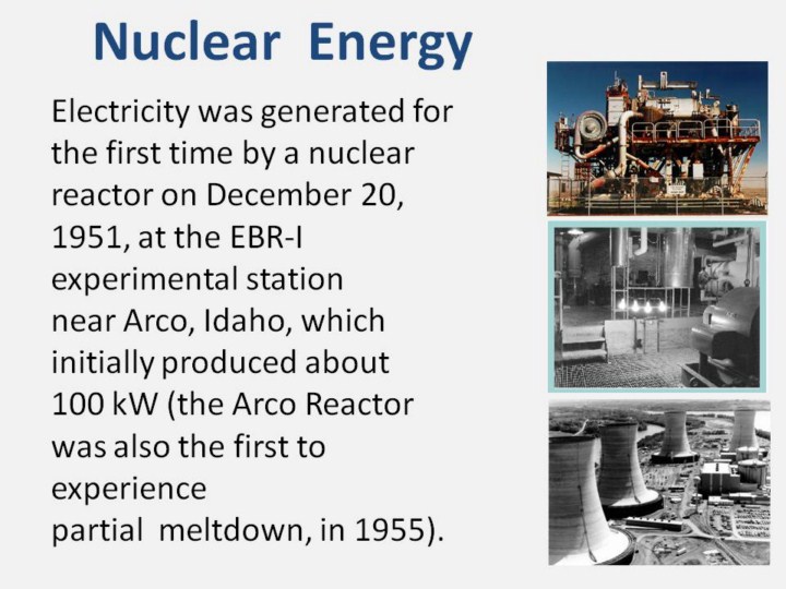 Electricity was generated for the first time by a nuclear reactor on December 20, 1951, at the EBR-I experimental station near Arco, Idaho, which initially produced about 100 kW (the Arco Reactor was also the first to experience partial meltdown, in 1955). In 1952, a report by the Paley Commission for President Harry Truman made a "relatively pessimistic" assessment of nuclear power, and called for "aggressive research in the whole field of solar energy.” A December 1953 speech by President Dwight Eisenhower, "Atoms for Peace," emphasized the useful harnessing of the atom and set the U.S. on a course of strong government support for international use of nuclear power. The idea behind the breeder is to maximize the useful energy that can be extracted from natural uranium. Inside a nuclear reactor, uranium-238 — the common form of the metal which cannot be used for fuel — can capture neutrons released during fission and transform into plutonium-239. This man-made element can fuel reactors, so breeding makes it possible to use virtually 100 percent of the energy in natural uranium. EBR-I provided the first proof that breeding is possible: On June 4, 1953, the U.S. Atomic Energy Commission announced that EBR-I had become the world's first reactor to demonstrate the breeding of plutonium from uranium. http://en.wikipedia.org/wiki/Nuclear_power#History