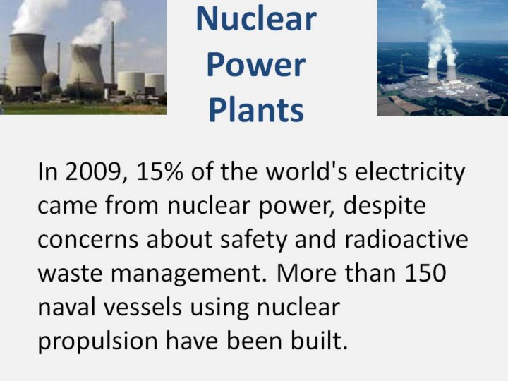 Nuclear power is power (generally electrical) produced from controlled (i.e., non-explosive) nuclear reactions. Commercial plants in use to date use nuclear fission reactions. Electric utility reactors heat water to produce steam, which is then used to generate electricity. Today, more than 100 nuclear power plants provide 20 percent of the electricity consumed in the United States. More than 439 reactors provide some 17 percent of the world's electricity, and about 65 more plants are under construction around the world. In 2009, 15% of the world's electricity came from nuclear power, despite concerns about safety and radioactive waste management. Nuclear fusion reactions are widely believed to be safer than fission and appear potentially viable, though technically quite difficult. Fusion power has been under intense theoretical and experimental investigation for many years. Both fission and fusion appear promising for some space propulsion applications in the mid- to distant-future, using low thrust for long durations to achieve high mission velocities. Radioactive decay has been used on a relatively small (few kW) scale, mostly to power space missions and experiments. International research is continuing into safety improvements such as passively safe plants, the use of nuclear fusion, and additional uses of process heat such as hydrogen production (in support of a hydrogen economy), for desalinating sea water, and for use in district heating systems. |
