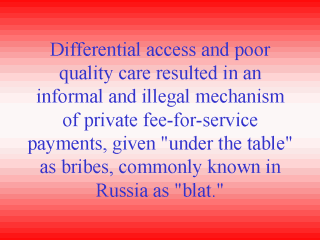 Medical necessities, surgery, drugs, bandages, clean sheets, even food, often had to be bought by inpatients from hospital administrators, physicians, nurses, or orderlies. For those without the economic resources to purchase private medical care, the minimal prevailing level of government care had to suffice. This often meant being hospitalized for extensive observational periods without receiving any specific treatments because of an intermittent lack of equipment and adequately trained specialists. Shortages in intravenous fluids, sutures, antibiotics, vaccinations, and durable goods such as tape and bandages were endemic and even openly criticized in the press by the Communist Party Congresses (Brezhnev 1981; Feshbach 1982a, 1985a).