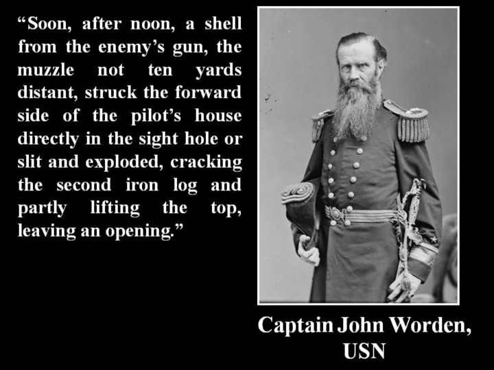 Toward the close of the action, the Confederate ironclad inflicted its last and most significant casualty, the Monitor’s skipper John Worden. LT S. Dana Green, the Monitor’s executive officer described the event: “Soon, after noon, a shell from the enemy’s gun, the muzzle not ten yards distant, struck the forward side of the pilot house directly in the sight hole or slit and exploded, cracking the second iron log and partly lifting the top, leaving an opening. Worden was standing immediately behind this spot and received in his face the force of the blow which partly stunned him and filling his eyes with powder, utterly blinded him...