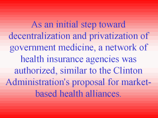 | A basic change in financing shifted direct tax revenues from centrally administered health care to individual- and employer-based insurance premiums for a private, profit-oriented delivery system. Such market incentives were provided to motivate the formation of competing insurance plans. Risks to the insurance plan were constrained by the type of benefits provided. |