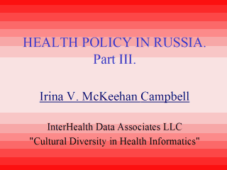 of this lecture? 1993 HEALTH INSURANCE ACT OF RUSSIA AND EQUITY Privatization of medical care was hindered in Russia by the lack of a legal framework to undergird the operation of market forces within the post-Coup Russian economy. Russia's struggle to join the international community of democratic nations has been a painfully slow process of transferring state-owned and operated industries, factories, and medical facilities over to private ownership. |