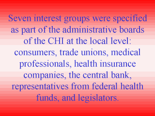 The administrative boards had the responsibility for developing the regulatory norms for implementing the HIA; managing the claims processing data base on insurance premiums; providing payments to insurance companies; developing capitation rates for premiums; and providing incentives for medical facilities to operate more efficiently.