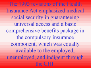 | The clause permitting a change in premiums if the health status of the insured changed within a three-year period was eliminated to protect against losing coverage from risk based insurance. All risk-based insurance was removed from the mandatory package and relegated to the supplementary benefits available in voluntary insurance plans, thus establishing a private insurance sector. |