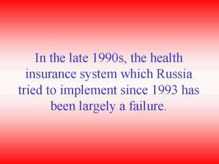 | A 1999 WHO report warned that the financial crisis threatens the continuation of Russia's floundering health insurance system. Under the demands of the IMF to privatize and decentralize government owned enterprises, Russia legislated away its centralized state health service for its regional insurance system. |
