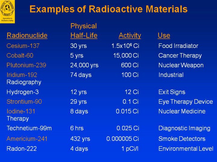 The nuclides that are in orange are those that are considered to be potential nuclides that could be present in a radiological dispersal device.