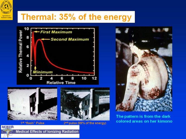 Thermal pulse . Immediately after an explosion, energy is emitted in the form of thermal radiation and, due to the extremely high temperatures, as x rays, which are absorbed within a few feet of air. The energy is then re-emitted and, due to certain phenomena occurring within the fireball, the secondary thermal radiation emission occurs in two pulses. First pulse. The first pulse lasts only about one tenth of a second. It consists of approximately 1 percent of the total thermal radiation release, and much of the thermal release is in the ultraviolet region. Although ultraviolet radiation can cause skin burns, it appears that this occurs only at ranges at which other thermal radiation effects are more serious. However, although this first pulse may be disregarded as a source of skin burns, it is capable of producing permanent or temporary effects on the eyes, especially if one is looking in the direction of the detonation at the time of the explosion. Second pulse. The second pulse lasts for several seconds and carries about 99 percent of the total thermal radiation energy. Since the temperature is lower than that in the first pulse, most of the rays reaching the Earth consist of visible and infrared light. This radiation is the main cause of various degrees of skin burns suffered by exposed individuals up to at least 12 miles.