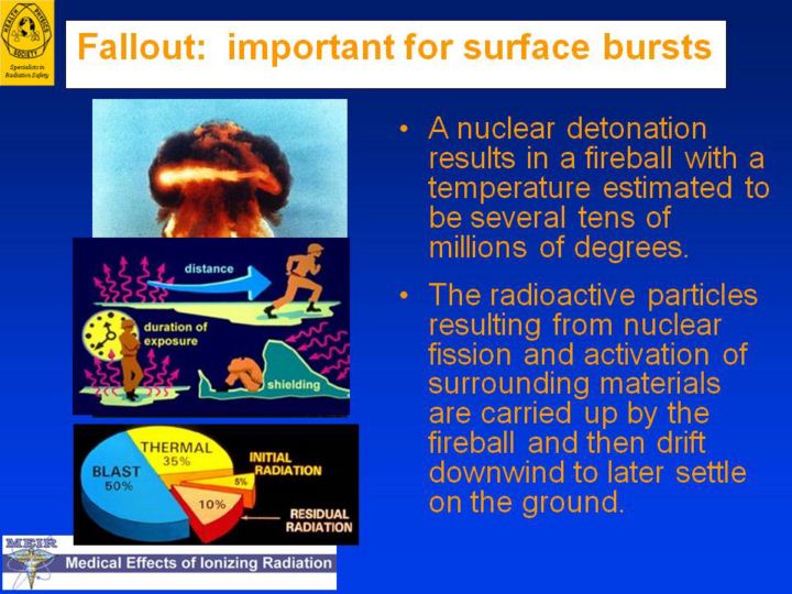 Nuclear fallout The detonation of a nuclear weapon releases a tremendous amount of energy. While the majority of that released is blast and thermal energy, 15 percent of it is in the form of nuclear radiation. Nuclear radiation is categorized as initial or delayed, according to the time after detonation that it is produced. Initial radiation, in the form of gamma rays, is produced within the first 60 seconds after detonation. Within that 60 seconds, the fireball reaches an estimated height of 2 miles, the estimated effective range of gamma rays in air. Delayed radiation is that produced after the first 60 seconds and includes induced radiation and fallout.