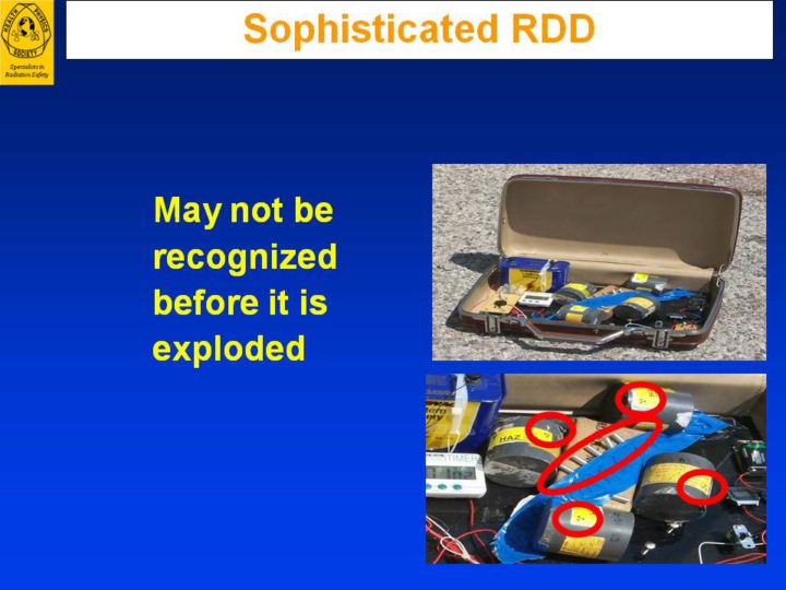 If a more sophisticated RDD is disguised as an everyday item, the public and responders may not recognize the device as an RDD. A bomb squad or Explosive Ordinance Disposal (EOD) team may be able to recognize the radiological material inside the device. The picture shows a simulated dirty bomb assembled built by the Nevada Test Site staff from with fake explosives, real radiological material (gray cylinders), and fake industrial radiation sources. |