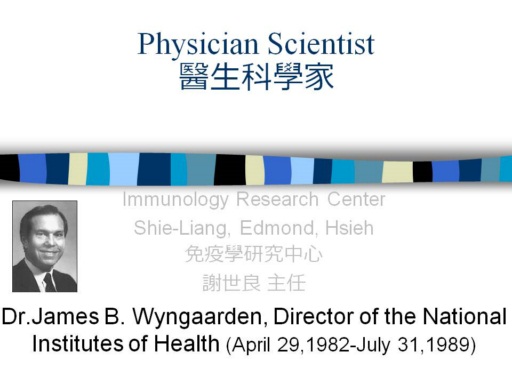 http://www.nih.gov/about/almanac/historical/directors.htm#wyngaarden James B. Wyngaarden, M.D. Dr. James B. Wyngaarden, an internationally recognized authority on the regulation of purine biosynthesis and the genetics of gout, and a nationally respected advisor on various aspects of the administration of biomedical research, became the 12th director on April 30, 1982. Immediately prior to his appointment, he was professor and chairman of the department of medicine at Duke University School of Medicine, a position he had held since 1967. He has had a long association with the NIH. From 1953 to 1954, he was a research associate in the Laboratory of Chemical Pharmacology of the then National Heart Institute, and from 1954 to 1956, he was a clinical associate at the then National Institute of Arthritis and Metabolic Diseases. After leaving in 1956 to become associate professor at the Duke University School of Medicine, he continued an association with NIH. He has held grants from several NIH components. Dr. Wyngaarden has been active on various NIH study groups, evaluation committees, and review panels over the years, including a term with the board of scientific counselors of the then NIAMD (1971-1974). He also served as a consultant to the NIH as a member of study sections (1958-1960; 1967-1969). He has also served as advisor to the broader scientific community as a member of the National Academy of Sciences since 1974, and was active from 1975 to 1982 on an NAS committee set up to study the Nation's overall need for biomedical and behavioral researchers; consultant for the President's Office of Science and Technology (1966-1972), a member of the President's Science Advisory Committee (1972-1973), and a member of the U.S. Atomic Energy Commission's Advisory Committee on Biology and Medicine. Dr. Wyngaarden is the coauthor of Cecil Textbook of Medicine. In collaboration with former NIH director, Dr. Fredrickson, and others, he edited The Metabolic Basis of Inherited Disease. The original work was published in 1960. He attended Calvin College there, and Western Michigan University in 1943-1944. In 1948 he graduated first in his class from the University of Michigan Medical School. Dr. Wyngaarden trained in internal medicine at the Massachusetts General Hospital and did postdoctoral work at the Public Health Research Institute of the City of New York, under the direction of Dr. DeWitt Stetten, Jr., former NIGMS director. After serving as research associate at NIH from 1953 to 1956, he went to Duke and in 1959 became director of the medical research training program there as well as associate professor of medicine and biochemistry. In 1961 he became professor of medicine and associate professor of biochemistry. In 1963 and 1964, he was a visiting scientist at the Institute de Biologie-Physiocochemique in Paris. Shortly after his return to this country, he left Duke to become professor and chairman of the department of medicine and professor of biochemistry at the University of Pennsylvania. He returned to Duke in 1967. Dr. Wyngaarden has received many honorary degrees: University of Michigan (D.Sc., 1980), Medical College of Ohio (D.Sc., 1984), University of Illinois at Chicago (D.Sc., 1985), George Washington University (D.Sc., 1986), and Tel Aviv University (Ph.D., 1987). He is a diplomate of the American Board of Internal Medicine. He has served on editorial boards of numerous professional publications. Dr. Wyngaarden is a member of a number of professional societies including the NAS Institute of Medicine, the American Academy of Arts and Sciences, the American Society for Clinical Investigation, and is a past president of the Association of American Physicians. He is a fellow of the Royal College of Physicians of London and was elected to the Royal Academy of Sciences of Sweden in 1987. |