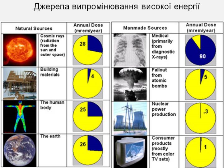 Є багато джерел шкідливих, висока енергія випромінювання. Промислові рентгенологів в основному пов'язані з впливом з рентгенівських генераторів і радіоактивні ізотопи. Важливо розуміти, що вісімдесят відсотків людського впливу відбувається з природних джерел, таких як космічний простір, порід і ґрунту, газу радону, і людського тіла. Решта двадцять відсотків надходить з антропогенних джерел випромінювання, таких, як ті, які використовуються в медичних та стоматологічних діагностичних процедур. Одним з джерел природної радіації космічного випромінювання. Земля і все живе на ній постійно обстріляли випромінювання з космосу. Сонця і зірок випромінює ЕМ випромінювання всіх довжин хвиль. Заряджених частинок від Сонця і зірок взаємодіють з земної атмосфери і магнітного поля для виробництва душ випромінювання, як правило, бета-і гамма-випромінювання. Дози космічної радіації істотно розрізняється в різних частинах світу через розбіжності по висоті і наслідки магнітного поля Землі. Радіоактивний матеріал, також знаходиться в природі повсюдно. Це відбувається природним чином в грунті, воді, рослинах і тваринах. Основних ізотопів заклопотаність у наземних випромінювання урану і продуктів розпаду урану, таких, як торій, радій, і радон. Низький рівень урану, торію та продуктів їх розпаду можна знайти всюди. Деякі з цих матеріалів з їжею і водою, а інші, такі як радон, у вигляді інгаляцій. Дози від наземних джерел варіюється в різних частинах світу. Країна з більш високою концентрацією урану і торію у грунті мають більш високі рівні доз. Всі люди також мають радіоактивні ізотопи, такі як калій-40 і вуглецю-14, всередині їх тіл. Зміни в дозі від однієї людини до іншої, не такі великі, як зміни в дозі від космічних і наземних джерел. Є також цілий ряд штучних джерел випромінювання, які представляють деякі експозиції для публіки. Деякі з цих джерел включити тютюн, телевізори, детектори диму, горючих матеріалів, деякі будівельні матеріали, ядерне паливо для виробництва енергії, ядерна зброя, медичні та стоматологічні рентгенівські промені, ядерна медицина, рентгенівських систем безпеки і промислової радіографії. Безумовно , найбільш значним джерелом антропогенного впливу радіації для звичайної людини становить від медичних процедур, таких, як діагностичних рентгенівських променів, ядерної медицини та променевої терапії. http://www.ndt-ed.org/ EducationResources/CommunityCollege/RadiationSafety/theory/sources.htm |