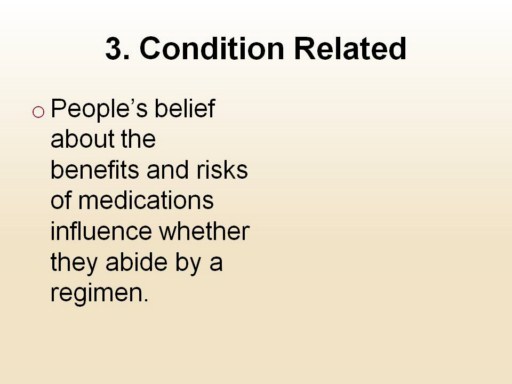 People’s belief about the benefits and risks of medications influence whether they abide by a regimen. Educating patients about disease process, importance of treatment or prevention, and consequences if not treated motivates the patient to take medication and reinforces the benefits of medication adherence. |