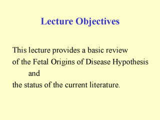 | The lecture provides an overview of the fetal origins of disease hypothesis and the status of the current literature. We present supporting evidence and not so supporting evidence for the hypothesis; briefly discuss the potential role of nutrition; possibility of confounding, and an alternative hypothesis that has recently been put forward in the literature. |